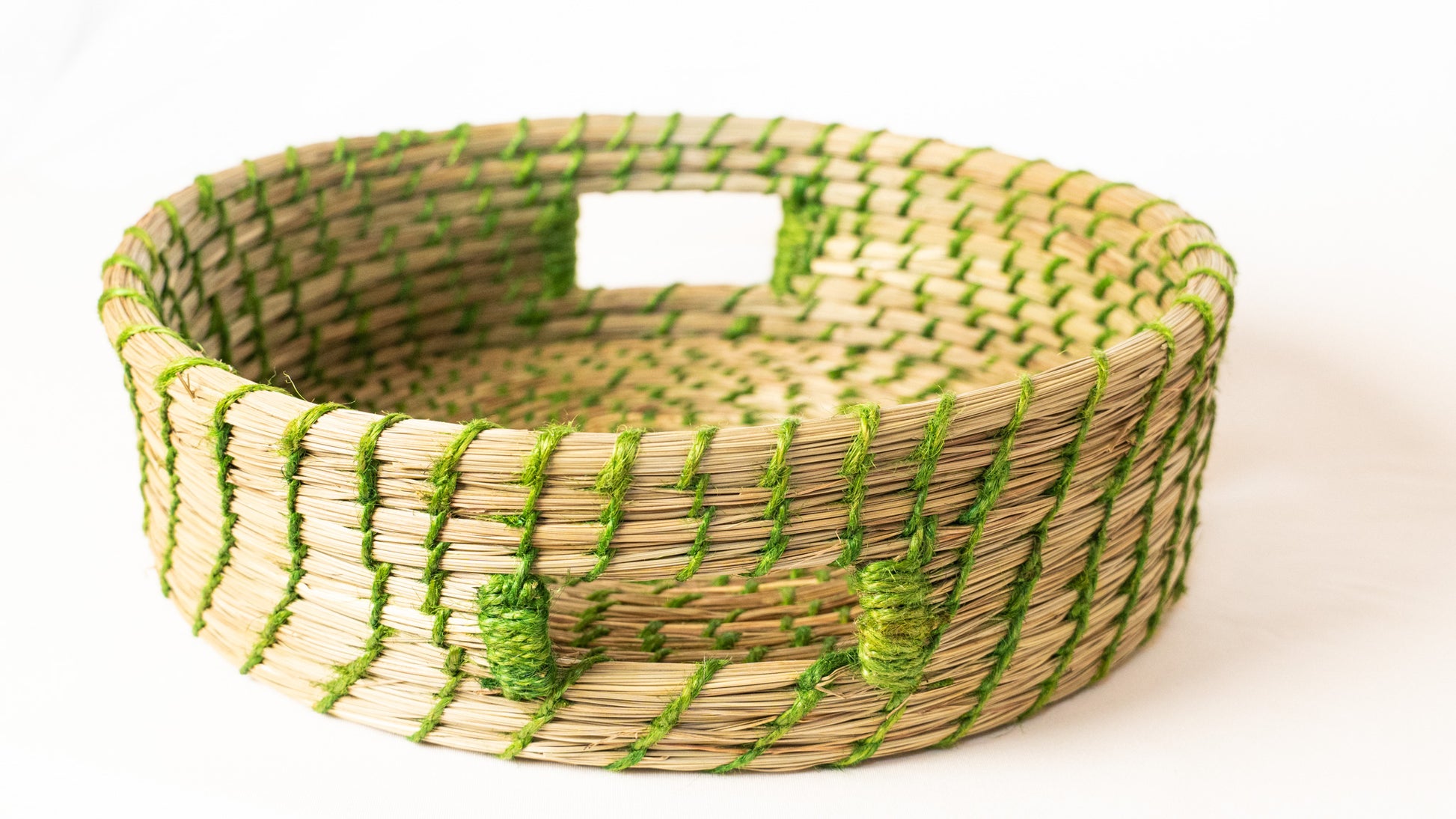 This Round-shaped basket, crafted from Sabai grass, is ideal for serving bread of any size. Its elegant design includes handles for easy portability. Versatile in use, it serves as a vegetable or fruit organizer, bread tray, or storage bin for essentials, and can also enhance the look of center tables. Made from eco-friendly Sabai grass, a perennial tufted grass with woolly sheaths, it supports sustainable living by decomposing naturally. Easy to care for, it is washable at home and can be cleaned with a brush or damp cloth; sun-drying helps extend its durability.